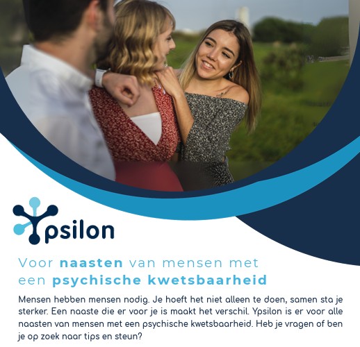 Mensen hebben mensen nodig. Dus als je een familielid hebt met een mentale kwetsbaarheid, dan blijf je nabij. Maar wist je dat je als ouder, broer, zus, partner, kind of vriend(in) zelf óók recht hebt op ondersteuning? Al meer dan 40 jaar lang kunnen familieleden en naasten van mensen met een psychische kwetsbaarheid hiervoor terecht bij Ypsilon. In de flyer ‘Wat biedt Ypsilon?’ lees je wat we voor jou kunnen betekenen en wat de voordelen zijn als je lid wordt.